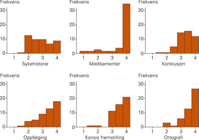 Det var tydelig forskjell i vurderingene til de fire skårerne, som illustrert ved fordelingen av poeng for kriteriet «sykehistorie» (fig 2). Sykehuslegene (skårer 2 og skårer 4) hadde i gjennomsnitt høyere skår enn allmennlegene (skårer 1 og skårer 3) på tre av de seks kriteriene: «sykehistorie» (differanse 0,36, p < 0,001), «konklusjon» (differanse 0,38, p < 0,001) og «ortografi» (differanse 0,23, p = 0,05). For de resterende tre kriteriene var det ingen statistisk signifikant forskjell i skåring mellom sykehuslegene og allmennlegene, men for to var det en tendens til at sykehuslegene skåret høyere.