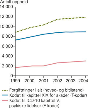 Antall utskrivninger med forgiftning kodet til ICDs skadekapittel (T-koder) økte fra 7 352 episoder i 1999 til 8 954 i 2004. Tilsvarende tall for akutte forgiftninger knyttet til avhengighet (F-koder) økte fra 1 572 til 2 917 (fig 1). Antall akutte forgiftninger behandlet ved somatiske sykehus økte med 33 % i perioden. Raten for heldøgnsopphold med hovedtilstand akutt forgiftning var 167 per 100 000 innbyggere (tab 3). For hoved- og bitilstander samlet var raten 237 per 100 000.