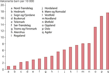Figur 1 og figur 2 viser henholdsvis hvor mange barn og ungdom under 18 år og hvor mange voksne per 10 000 innbyggere som fikk allergivaksinering i hvert fylke. Et senter i Aust-Agder behandlet mange pasienter fra Vest-Agder, og pasientene fra Finnmark fikk behandling i samarbeid med en avdeling i Tromsø. Derfor er de to Agder-fylkene slått sammen, det samme er tilfellet for Troms og Finnmark. Av de 37 private sentrene var det 23 i de fire fylkene Oslo, Akershus, Østfold og Vestfold, mens det bare var ett privat senter i de fem nordligste fylkene.