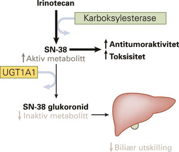 Topoisomerase I-hemmeren irinotecan, som særlig brukes ved tykktarmskreft, er et ikke-aktivt legemiddel som omdannes av karboksylesterase til den aktive metabolitten SN-38. Enzymet UDP-glukuranosyltransferase 1A1 (UGT1A1) konjugerer SN-38 til et inaktivt glukuronid som først og fremst skilles ut via galle (fig 1). Det er påvist stor variasjon i ekspresjon av dette mikrosomale leverenzymet og inntil 50 ganger forskjell i glukorinideringshastighet for SN-38 ulike pasienter imellom (6). UGT1A1-genet har flere variantalleler som er assosiert med redusert SN-38-glukuronidering og økt toksisitet (3). Det er nå gode holdepunkter for å anta at genotyping av UGT1A1 kan predikere toksisitet, og det er vist at bærere av A3156A- eller UGT1A1*2-variantene er særlig utsatt for alvorlig beinmargssuppresjon og antakelig bør ha reduserte doser av irinotecan (3). Imidlertid må en slik doseringsstrategi verifiseres gjennom prospektive kliniske studier.