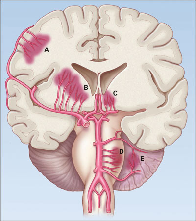 Det er vanlig å klassifisere hypertensjon både som en risikofaktor for og som en årsak til hjerneblødning. De vanligste lokalisasjoner er i striatum (særlig putamen), thalamus, pons og cerebellum (fig 1) (6). Man antar at blødninger i disse områder som regel skyldes ruptur av små arterioler, på basis av degenerative forandringer indusert av hypertensjon (6). Risikoen for residivblødning er klart korrelert til blodtrykk; 10 % per år ved diastolisk blodtrykk > 90 mm Hg og < 1,5 % per år ved diastolisk blodtrykk < 70 mm Hg (7).