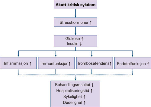 Glukosenivået stiger som respons på akutt sykdom. Dette skyldes den stressrelaterte endokrine aktivering som fører til økt glukoseproduksjon og økt insulinresistens. Det er vist at hyperglykemi under hospitalisering er assosiert med økt dødelighet, uavhengig av om pasienten har diabetes eller ikke (5)-(10). Det er økende interesse for effekten av både hyperglykemi og insulin på inflammatoriske variabler, immunfunksjon, trombosedanning og endotelfunksjon og den mulige sammenhengen med klinisk behandlingsresultat (1, 11). Figur 1 viser sterkt forenklet denne sammenhengen.