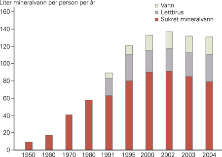 Mineralvannomsetningen i Norge har vist en kraftig stigning fra 1950 og frem til år 2000 for deretter å flate ut (fig 1) (9). Mineralvann både med og uten sukker er den tredje mest vanlige drikkevaren etter vann fra kran og kaffe i den norske befolkningen (9). Tall fra år 2003 viser at bare Irland og USA har et høyere forbruk enn Norge, mens Frankrike og Italia ligger på bunnen med under halvparten av forbruket i USA og Irland (fig 2) (10).