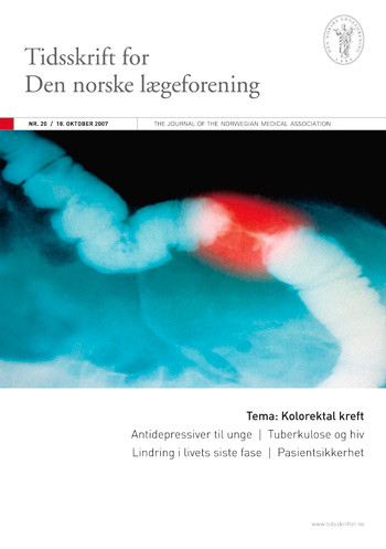 Forsidebildet viser en kreftsvulst i colon ved røntgenundersøkelse med barium dobbeltkontrast. Undersøkelsesmetoden er i dag stort sett forlatt fordi endoskopi og CT gir bedre treffsikkerhet ved diagnostikk for kolorektal kreft. Bildet er meget illustrerende og valgt fordi det i dette nummer av Tidsskriftet starter en stor temaserie om kolorektal kreft.