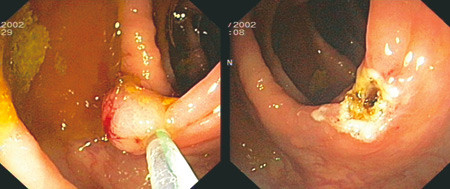 Små polypper under 3 – 4 mm vil kunne fjernes med stor biopsitang med én eller flere biopsitagninger. Alternativt kan man bruke «hot biopsy»-reseksjon (biopsi med varmekoagulasjon). Undersøkelser har vist viabelt gjenstående polyppmateriale i 17 % av prosedyrene ved denne metoden, og den innebærer en viss perforasjonsrisiko. Små slynger kan også brukes, og «kald giljotinering», dvs. at man river av polyppen uten koagulasjonsstrøm, har vist seg trygt ved små polypper (< 5 mm) (26). Polypper større enn 5 mm vil i de fleste tilfeller kunne fjernes med diatermislynge (fig 1). Ved store, stilkete polypper kan det injiseres fortynnet adrenalin i stilken eller brukes såkalt endoloop (en trådslynge som strammes rundt polyppen) i forkant for å redusere blødnings- og perforasjonsfaren (27).