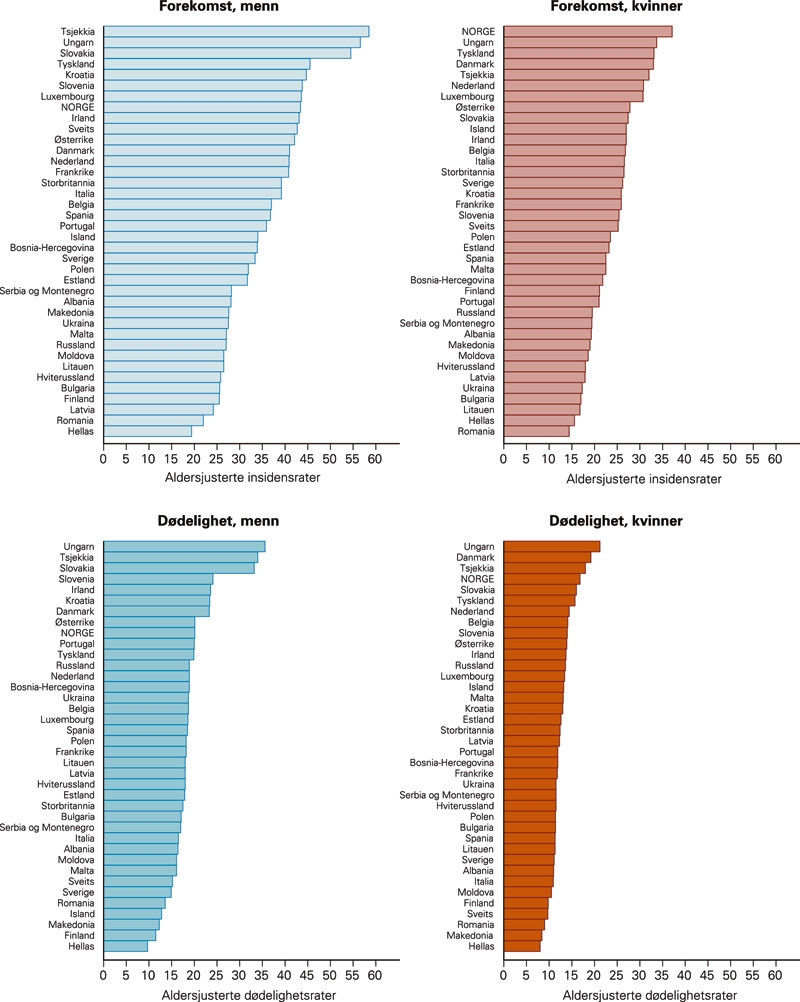 Figur 1 viser Norges plassering i rangeringen av aldersjusterte insidens- og mortalitetsrater for utvalgte europeiske land. Både for insidens og mortalitet ligger Norge høyt plassert for begge kjønn. Ratene for menn er aller høyest i land som Ungarn, Slovakia og Tsjekkia, men de norske ratene ligger høyt oppe både for insidens og mortalitet. Basert på disse 2002-anslagene har kvinner i Norge den høyeste forekomsten av tykktarms- og endetarmskreft i Europa.
