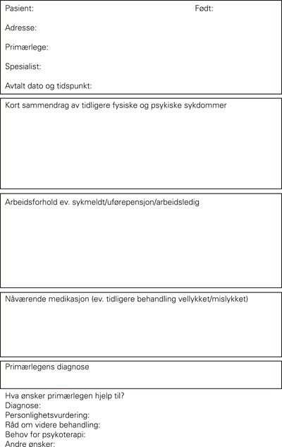Fra oktober 2001 har en fastlege (GM f. 1948) hatt en avtale med en erfaren psykiater (JK f. 1946) om å kunne henvise egnede pasienter til en felleskonsultasjon. Formålet har vært å avklare spesifiserte problemområder (diagnose, behandling, trygdespørsmål m.m.) hos pasienter som fastlegen skal følge opp videre. Fastlegen avtaler tid direkte på telefon og sender opplysninger om pasienten til spesialisten på forhånd (fig 1). Ventetiden har vært 1 – 2 uker. Pasienten får så beskjed om rammen for samtalen: Pasient og fastlege møter på psykiaterens kontor. Det er avsatt én klokketime til samtale mellom psykiater og pasient. Fastlegen er for det meste tilhører, men kommer med enkelte kommentarer og spørsmål. Deretter forlater pasienten kontoret, og fastlege og psykiater bruker ca. en halv time til faglig drøfting og til å skrive ferdig en felles rapport om diagnose og videre behandling. Hele seansen, inkludert skriving av rapport, tar altså ca. 90 minutter. Alle pasientene blir etterpå spurt om hvordan de har opplevd felleskonsultasjonen.