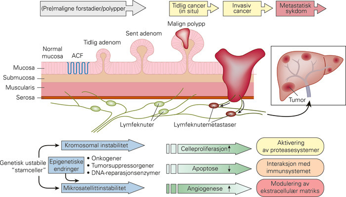 Karsinogenesen fra normal mucosa til metastatisk kolorektal kreft (fig 1) er i økende grad forstått som en multidimensjonal interaksjon mellom genetiske endringer, slimhinnens epitelceller og de omliggende faktorene i ekstracellulære matriks, inkludert immunsystemet, proteasesystemer og bindevevsceller (2). I denne artikkelen tar jeg opp noen av de nyere sentrale dogmene relatert til den tidlige utviklingen av kolorektal kreft, hvordan denne kunnskapen nå gradvis endrer den molekylærbiologiske klassifiseringen og gir muligheter for bedre diagnostikk, mer korrekt prognose og bedre behandling.