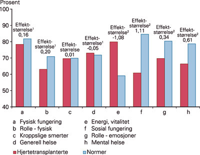 Selvvurdert helse og fysisk funksjon ble målt med Short Form-36 (SF-36) (14). Dette spørreskjemaet har åtte underfaktorer som omhandler ulike sider ved opplevd helse og hva hun eller han er i stand til å gjøre. Norske normdata eksisterer (15). Normene som er brukt i denne artikkelen, er vektet slik at de tilsvarer kjønns- og aldersfordelingen i utvalget av hjertetransplantasjonspasientene.