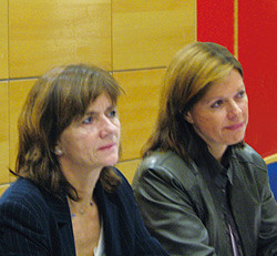 Torunn Janbu og Anne Kjersti Befring lytter oppmerksomt til presentasjonen av kravene til ny hovedavtale. Foto Lise B. Johannessen