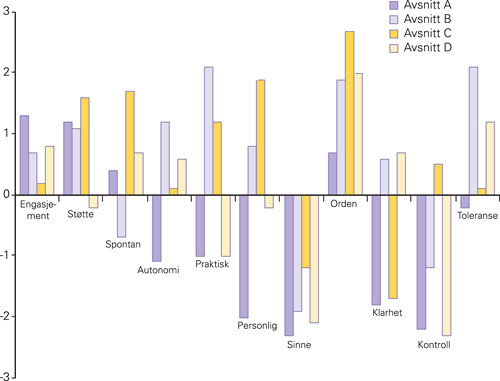 For de fleste subskalaene lå personalskåren nærmere gjennomsnittet ved psykosepostene enn pasientskåren, men ved tre avsnitt lå nivået for orden og organisasjon langt over og nivået for sinne og aggressiv atferd betydelig under gjennomsnittet. Personalet skåret signifikant høyere enn pasientene på praktisk orientering (p < 0,01), personlig problemorientering (p < 0,05), sinne og aggressiv atferd (p < 0,001) og programklarhet (p < 0,01), mens pasientene skåret høyest på orden og organisasjon (p < 0,05).