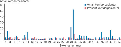 Samdata Helse 2005 fra SINTEF Helse viser at i perioden 2004 – 05 var gjennomsnittlig andel av korridorpasienter for alle landets sykehus 2 – 3 % (11). Basert på data fra www.sykehusvalg.no for perioden 2. tertial 2006 var det ved norske sykehus gjennomsnittlig fem pasienter på korridor per sykehus, eller 2 % av sengene (9). Forekomsten av korridorpasienter varierte sterkt mellom sykehusene, fra null til 52 (0 – 10 %) (fig 1). På landsbasis var gjennomsnittlig 256 pasienter på korridor per døgn i 2. tertial 2006, 253 i 3. tertial og 283 i 1. tertial 2007 (9). Det er ikke angitt hvilke avdelinger som har korridorpasienter, men tidligere data innhentet av Helsetilsynet senest i 2003 om forekomst av korridorpasienter ved medisinske avdelinger, viste at det da var gjennomsnittlig 175 pasienter på korridor i medisinske avdelinger i norske sykehus (10). Samtidig var det 244 utskrivningsklare pasienter (10).