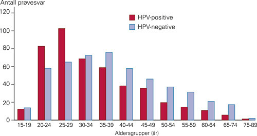 Av 951 HPV-tester i forsøksperioden var 18,9 % tatt fra kvinner yngre enn 25 år eller eldre enn 67 år. 2,7 % av kvinnene var yngre enn 20 år. Hele 47,6 % av prøvene representerte positiv HPV-test, slik at materialet var selektert (fig 1).