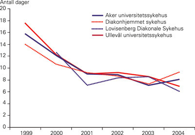 Figur 1 viser at reduksjonen av gjennomsnittlig ventetid for pasienter fra de somatiske avdelinger var tilnærmet lik ved de fire sykehusene i kommunen.