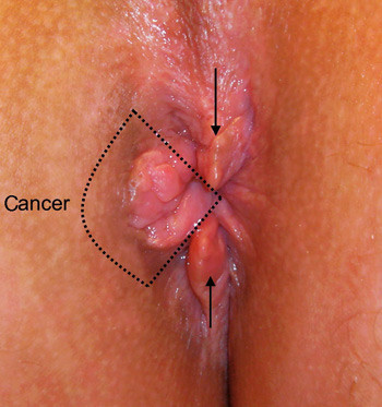 Vanligvis ses en litt ujevn, buklet rød forandring i slimhinnen som er fortykket, gjerne som en knute, som kan være helt jevn og glatt, men som oftest er det ujevn overflate med vekslende sårflater og typiske dype furer, gjerne med fissur sentralt (fig 1). Eksemliknende utslett med lett fortykket, lyserød hud forekommer. Noen tumorer kan likne kondylomer, og faktisk kan noen kondylomer utvikles til invasiv plateepitelcancer. Et hovedtegn er at tumor kjennes hard ved palpasjon. I tidlige stadier kan slimhinnen bare være rød (oftest ved cancer in situ-forandringer) eller ha en ujevn, kornet, fløyelsaktig rød overflate.