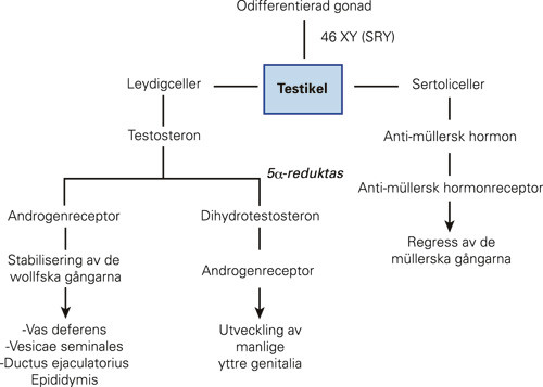 Under de första 6 – 8 graviditetsveckorna är de primitiva gonaderna och anlagen för utveckling av inre genitalia (de müllerska och wollfska gångsystemen) och yttre genitalia identiska hos pojkar och flickor (3). Strukturerna är bipotenta med förmåga till utveckling i både manlig och kvinnlig riktning. Om en Y-kromosom med fungerande SRY-gen finns i genomet kommer den primitiva gonaden att utvecklas till en testikel. I 7 – 8 graviditetsveckan börjar sertolicellerna att producera anti-müllerskt hormon och cirka en vecka senare startar testosteronproduktionen från leydigcellerna.