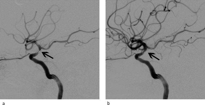 Ved cerebral angiografi fant man at det forelå en 90 % distal venstresidig stenose i a. carotis interna med redusert blodgjennomstrømming av venstre hjernehalvdel (fig 1a). Angiografisk bedømt forelå det få kollateraler og forsinket blodgjennomstrømming i venstre cerebrale hemisfære via a. comunicans anterior og a. comunicans posterior. Det var indikasjon for angioplastikk av stenosen. Ved bruk av ballongkateter (Maverick II) ble stenosen dilatert. Angiografisk ble reststenosen beregnet til 46 % (fig 1b). Etter ett døgn i intensivavdeling og to dager i slagavdeling ble pasienten utskrevet til hjemmet med uendret platehemmende medikasjon. Han var da symptomfri og uten svakhet i høyre hånd. Ved poliklinisk kontroll fire måneder senere var han fortsatt symptomfri, og blodtrykket var spontant normalisert.