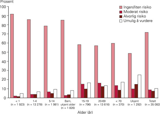 Antall henvendelser til Giftinformasjonen øker hvert år, og i 2006 var antallet nærmere 40 000 (1). Omtrent tre firedeler gjaldt akutte eksponeringer. I treårsperioden 2004 – 06 mottok Giftinformasjonen 35 802 henvendelser om akutte eksponeringer for kjemikalier eller kjemiske produkter hos mennesker. Dette utgjør 41 % av alle akutte eksponeringer, mens de resterende 59 % utgjøres av legemidler, planter/dyr, narkotika, næringsmidler mv. Omtrent en tredel av henvendelsene om akutte eksponeringer for kjemikalier kommer fra helsepersonell, mens ca. to tredeler kommer fra allmennheten. De vanligste eksponeringsmåtene er peroral og kontakt med øye med henholdsvis 56 % og 21 %, fulgt av inhalasjon (12 %) og kontakt med hud (6 %). I de aller fleste tilfeller skyldes eksponeringen et uhell (93 %), enten hjemme eller på arbeidsplassen. Under 5 % er selvforskyldt. De aller fleste eksponeringene (72 %) ble vurdert av Giftinformasjonen til ikke å medføre noen fare eller kun fare for lett forgiftning, mens bare 7,8 % ble vurdert til å innebære fare for alvorlig forgiftning (fig 1).
