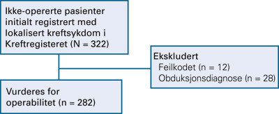 I alt var det meldt 322 pasienter med begrenset sykdom. Av disse ble 40 ekskludert, 12 var allikevel operert, men uten at dette var registrert i Kreftregisteret, og 28 pasienter fikk diagnostisert lungekreft først ved obduksjon. Det forelå dermed 282 pasienter med lokalisert lungekreft som ikke var meldt operert til Kreftregisteret, og som dermed tilfredsstilte inklusjon i denne analysen (fig 1).