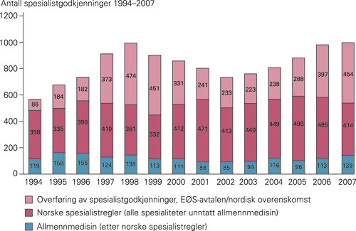 Det er flere forhold ved statistikken for spesialistgodkjenninger i 2007 som gir grunn til bekymring. Først og fremst er det bekymringsfullt at antallet norske statsborgere som er godkjent i 2007, bare er 349 hvis vi holder allmennmedisin utenfor, noe som er det laveste antallet siden 1999. Hvis vi i tillegg avgrenser til godkjenninger etter norske regler, er det bare gitt 309 spesialistgodkjenninger til norske statsborgere. Også dette er det laveste antallet siden 1999.