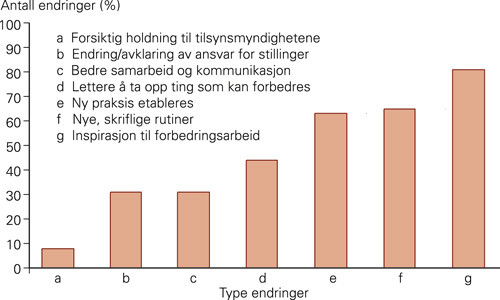 På spørsmål om tilsynet førte til endringer, svarte 92 % bekreftende. Mange rapporterte flere typer endringer som følge av tilsynet, til sammen 632 endringer. Det er sannsynlig at endringer er rapportert to eller flere ganger, fordi flere ansatte fra samme institusjon kan ha rapportert samme endringer. Det faktiske antall endringer må derfor antas å være noe lavere. Svarene tyder likevel på at tilsynet har resultert i betydelige endringer og at de fleste representerer forbedringer. Undersøkelsen viser at endringer ofte startet da meldingen om tilsyn ble mottatt.