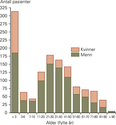 71 % av pasientene var menn, og 24 % var under tre år (fig 1). Dette er i tråd med nyere svenske data, der 69 % av alle innleggelser for brannskade i svenske sykehus i perioden 1987 – 2004 var hos menn og med 27 % av pasientene under fem år (5).
