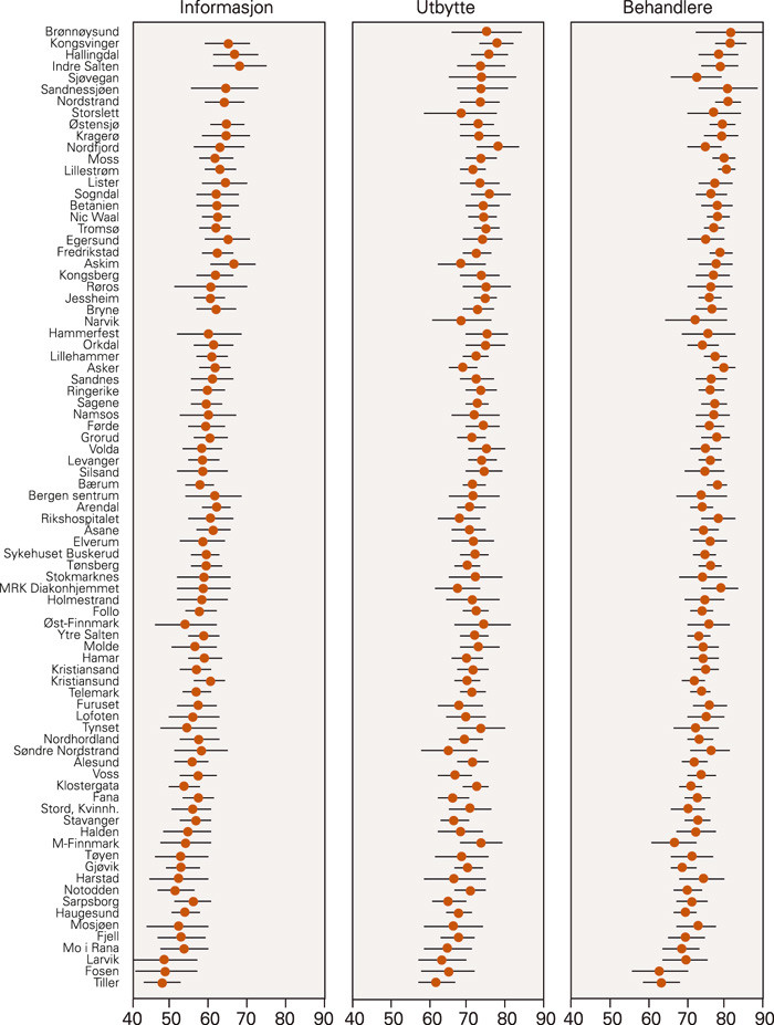 Flere av poliklinikkene har gjennomgående høye gjennomsnittsskårer på de tre dimensjonene, som Kongsvinger, Hallingdal og Brønnøysund (e-tab 2, fig 1). Generelt er det en god sammenheng mellom poliklinikkenes resultater på tvers av dimensjonene, noe som bekreftes av mønsteret i figur 1 samt av høye korrelasjoner mellom dimensjonene på poliklinikknivå – høyest korrelasjon mellom dimensjonene på poliklinikknivå er det mellom behandlerdimensjonen og dimensjonen informasjon/medbestemmelse (Pearsons r er 0,85), lavest korrelasjon er det mellom utbyttedimensjonen og behandlerdimensjonen (Pearsons r er 0,58).