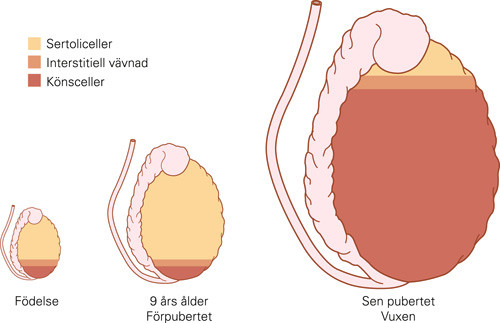 Testiklarna har en volym av 1 – 2 mL fram till pubertetsaktiveringen då nattliga sekretionspulser av LH orsakar testikeltillväxt (7). Vid 4 mL testikelstorlek vilket genomsnittligt inträffar vid 11,5 års ålder har androgenproduktionen nått sådana nivåer att genitaliatillväxten börjar. Uppnåendet av denna volym brukar också defineras som klinisk pubertetsstart. Testosteronnivåerna är då initialt stegrade enbart nattetid med en topp tidig morgon och dagnivåer är låga. Ett morgonvärde av testosteron över 1 nmol/L indikerar att gonadotropinaxeln är aktiv och att pubertetsutvecklingen kommer att sätta fart under det närmaste året (8). Starten av tillväxtspurten brukar sammanfalla med en testikelstorlek av 6 – 7 mL. «Spermarke», dvs fyndet av spermier i morgonurin inträffar vid cirka 10 – 12 mL samtidigt med maximal pubertetsspurt och sådana nivåer av östrogena hormoner att gynekomasti uppträder hos 30 – 50 % av alla pojkar. Vuxen testikelstorlek är 17 – 25 mL. Fynd av testisvolym mindre än 10 mL hos en vuxen man indikerar defekt germinalepitel. Ofta är då FSH-nivåerna över 10 IU/L som ett «kvitto» på gonadskada/gonaddysgenesi.