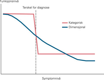 Figur 1 Forholdet mellom symptomnivå og funksjonsnivå i henholdsvis en kategorisk og en dimensjonal diagnose