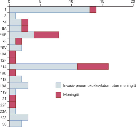 I perioden 1993 – 2003 ble til sammen 828 tilfeller av invasiv pneumokokksykdom hos barn under ti år meldt til Folkehelseinstituttet (1). Av disse hadde 181 (22 %) meningitt. Totalt 26 dødsfall ble rapportert.