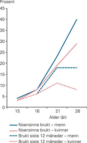 Andelen som har brukt hasj de siste 12 månedene synker noe for kvinner fra 20-årsalderen av (fig 1), mens vi for menn ser en utflatning. Likevel øker livstidsprevalensen kraftig i løpet av 20-årene – hos menn fra 23 % til hele 40 %, hos kvinner fra 19 % til 29 %. I tenårene var det små forskjeller mellom kjønnene, men etter fylte 20 år rapporterer mennene atskillig høyere forbruk enn kvinnene, både i løpet av hele livet og de siste 12 måneder (p < 0,001). Vi undersøkte også hvor ofte de aktive brukerne hadde tatt stoffet de siste 12 måneder. Ved 28 års alder hadde 70 % brukt det 1 – 10 ganger, mens bare 16 % av disse, eller 3 % av hele utvalget, hadde brukt hasj mer enn 50 ganger de siste 12 måneder.