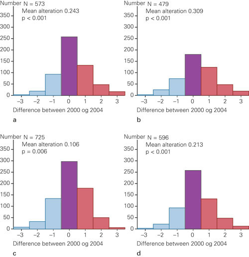 Endring i negativ retning var uavhengig av kjønn og ubetydelig assosiert med fagområde (data ikke vist). Yngre leger hadde i større grad endret syn i negativ retning fra 2000 til 2004. Dette gjaldt særlig utsagnet om at den som kritiserer, risikerer sanksjoner fra den administrative ledelsen.