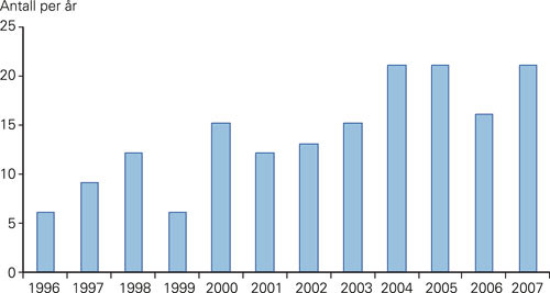Antall barn innlagt med nevroborreliose for hvert av de 12 studieårene er vist i figur 1. Det var en signifikant trend for økning i antall innleggelser når hele perioden ble vurdert som en helhet (p < 0,001). Antall innleggelser per år var signifikant flere i den siste seksårsperioden sammenliknet med den første seksårsperioden (median 18,5 (variasjon 13 – 21) versus 10,5 (variasjon 6 – 15), p = 0,004).
