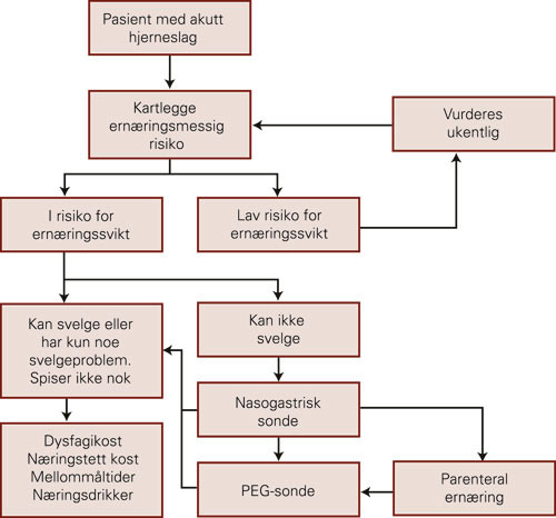 Med mat og drikke ønsker vi å dekke pasientens basale behov og bevare funksjoner. Med ernæringsbehandling er hensikten å bedre overlevelsen og mental og fysisk funksjon, dessuten øke effekten av rehabilitering, bedre livskvaliteten samt redusere liggetiden og minske ressursbruken. For å gi en riktig ernæringsbehandling bør pasientens ernæringsstatus undersøkes innen 48 timer etter sykehusinnkomst (31). Veiing inngår i de fleste kartleggingsmetoder, og opplysninger om vektendringer kan man få fra pasienten eller de pårørende. Undervekt, et forholdsvis stort vekttap eller en alvorlig svelgeparese er klare indikatorer på ernæringsmessig risiko. Når en pasient med akutt hjerneslag er identifisert som underernært eller i risiko for underernæring, skal vedkommende utredes videre slik at man kan utarbeide en individuell ernæringsplan. Deretter må tiltakene overvåkes og følges opp og justeres underveis (18). I figur 1 beskrives en plan for valg av ernæringsbehandling til pasienter med akutt hjerneslag.