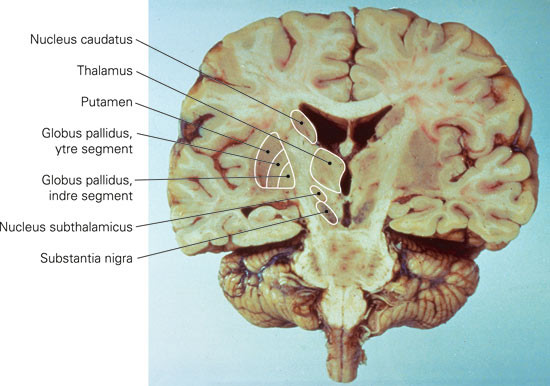 The basal ganglia consist of a complex network of nuclei and neural pathways. They participate in the planning of voluntary movement, but also seem to be involved in cognitive and affective functions. Basal ganglia dysfunction may lead to hypokinetic as well as hyperkinetic disorders, and many of these are caused by changes in dopaminergic activity. Nonetheless, pathophysiological explanations for the various movement disorders are not known in detail. It is likely that impulse frequency and firing patterns in neural loops through the basal ganglia are of great importance in both normal function and disease.