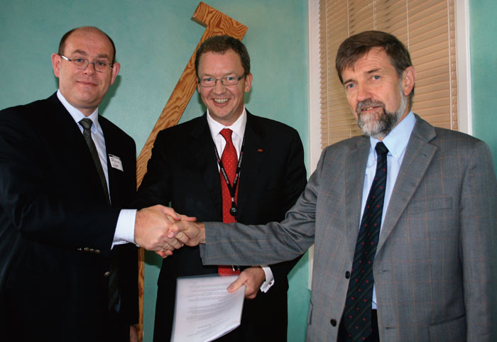 Fra v. Hans Kristian Bakke, leder i Sykehjelps- og pensjonsordningen for leger, Idar Kreutzer, konsernsjef i Storebrand ASA og Terje Vigen, generalsekretær i Legeforeningen, undertegnet avtalen om ny pensjonsordning for private legevirksomheter. Foto Lise B. Johannessen