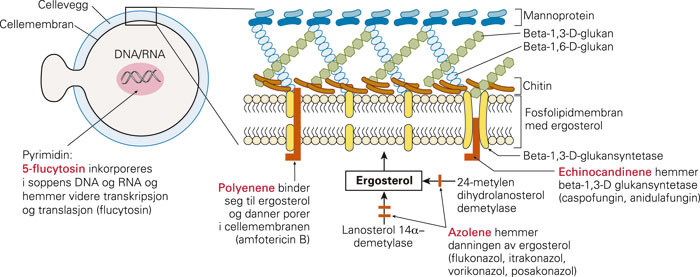 Antimykotiske midler interfererer med soppens stadige vedlikehold eller nydanning av cellevegg eller cellemembran (fig 1). Det er først og fremst ergosterol, som er en vesentlig komponent i soppens cellemembran, og beta-1,3-D-glukan i celleveggen som er målet for moduleringen. Resultatet blir drap av soppen eller hemming av videre vekst (fungicid eller fungistatisk effekt).