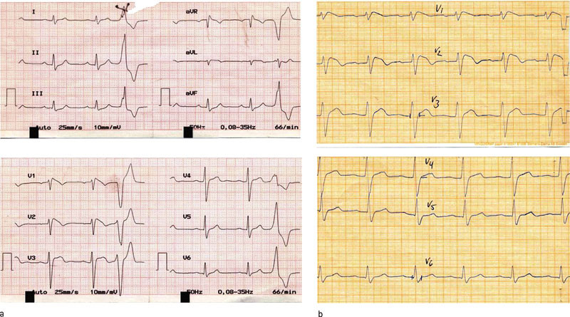 En 51 år gammel mann ble innlagt i sykehus etter en ulykke. Det ble tatt EKG som viste ST-elevasjon i avledningene V1 – V3 og høyre grenblokk. Det ble anbefalt at fastlegen skulle kontrollere EKG, og dersom forandringene fortsatt var til stede, skulle han henvises til kardiolog med tanke på strukturelle forandringer i høyre ventrikkel. Vi fikk tilsendt EKG fra pasientens faslege (fig 1a), et EKG som viste seg å være nærmest identisk med et EKG tatt 17 år tidligere (fig 1b), da pasienten var innlagt med diagnosen lungeemboli. Denne gang mistenkte vi at det dreide seg om Brugadas syndrom og det ble foretatt ytterligere undersøkelser. Nytt EKG (fig 2) viste fortsatt forandringer i de høyre prekordialavledninger. Holterregistrering viste sinusrytme med en del ventrikulære ekstrasystoler (VES), dels koblede (couplets) og enkelte episoder med tre i serie (triplets). Belastnings-EKG var upåfallende, bortsett fra forekomst av enkelte ventrikulære ekstrasystoler etter belastning, men ingen under selve belastningen. Ekkokardiografi var normal, spesielt ingen tegn til patologiske forandringer i høyre ventrikkel. MR-undersøkelse av hjertet (funksjonsundersøkelse og kontrastinjeksjon med tanke på forsinket kontrastopptak (delayed enhancement)) var normal. Det ble sendt inn blodprøve til medisinsk-genetisk laboratorium ved Rikshospitalet, og denne undersøkelsen viste at pasienten var heterozygot for spleisesetemutasjonen 3991-1, G > C i intron 21 i SCN5A-genet. Denne mutasjonen påvirker RNA-spleising og vil føre til et unormalt protein.