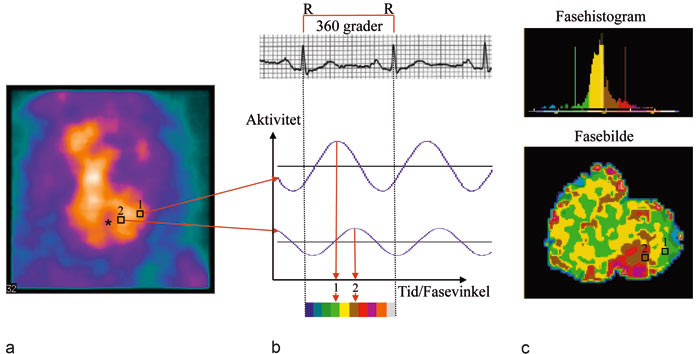 Ved Seksjon for nukleærmedisin, Universitetssykehuset Nord-Norge, har man i perioden 1998 – 2006 utført om lag 1 500 isotopventrikulografier for bestemmelse av venstre ventrikkels ejeksjonsfraksjon. Ved denne undersøkelsen merkes erytrocyttene med technetium. Isotopen fordeler seg jevnt i blodbanen og avbildes ved hjelp av gammakamera (blood pool scintigrafi). Normalt vil ejeksjonsfraksjonen være 55 – 80 % ved denne undersøkelsen. Ved hjertesvikt faller den. Ved undersøkelsen kan man i tillegg til ejeksjonsfraksjonsbestemmelser få frem bilder som viser ventrikkelveggens bevegelighet som følge av endring i ventriklenes blodvolum. Et såkalt fasebilde fremstilles ved hjelp av et kommersielt tilgjengelig dataprogram (XT ERNA, GE Medical Systems Europe, Frankrike) og er vist i figur 1.