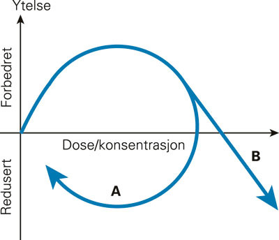 Teoretiske betraktninger trekker i retning av at økende amfetamindoser og -konsentrasjoner påvirker prestasjonsevnen på en bifasisk måte, slik at lave doser kan gi prestasjonsforbedringer (noe det finnes noen, men ikke entydige, eksperimentelle holdepunkter for), mens høyere doser gir en prestasjonsforringelse. Hysteresefenomener kan resultere i at amfetamineksponerte trafikanter kanskje er tryggere tidlig i forløpet enn senere, når reduserte nivåer monoamintransmittere i sentralnervesystemet og resulterende utmattelse dominerer det kliniske bildet. Noen aspekter ved dette er tidligere diskutert i fagtidsskrifter (33, 34), men har ellers ikke vært gjenstand for særlig oppmerksomhet.