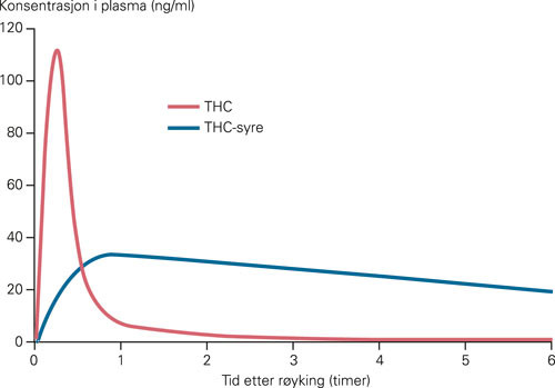 Delta-9-tetrahydrocannabinol blir vanligvis inntatt ved at hasj eller marihuana blandes med tobakk, rulles i sigaretter (joints) og røykes. Når cannabisrøyk inhaleres, absorberes dette stoffet raskt fra røyken, og konsentrasjonsprofilen i blodet (fig 1) likner den man ser ved intravenøs administrasjon (17, 18). Stoffet har høy fettløselighet og et stort tilsynelatende distribusjonsvolum, hvilket forklarer hvorfor konsentrasjonene i blod faller raskt de første timene etter et inntak (19). Etter et enkeltinntak vil 80 – 90 % av det som er inntatt, bli utskilt i løpet av 4 – 5 dager, hovedsaklig som fritt eller glukuronidert THC-syre (17, 20). På grunn av langsom utskilling fra fettvev og en betydelig grad av enterohepatisk sirkulasjon er den terminale halveringstiden for THC og THC-syre i serum lang, henholdsvis 1 – 2 døgn og 1 – 3 døgn (17). Tilsvarende halveringstid er også vist for THC-syre i urin (21). Den komplekse farmakokinetikken er godt beskrevet andre steder (17, 18), og har nylig også vært tema i en oversiktsartikkel i Tidsskriftet (20).
