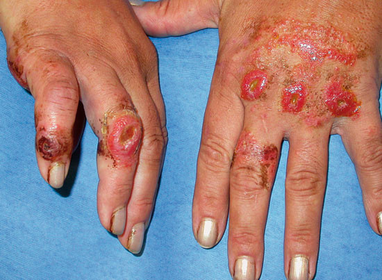 Det var et relativt skarpt avgrenset område, 10 x 13 cm, dorsalt på venstre underarm med papulovesikuløse eksematøse erosive elementer. I tillegg var det ulcerasjoner dorsalt på de tre midtre metakarpofalangealleddene (MCP-leddene) på venstre hånd og palmart på høyre hånds femte MCP-ledd. Sårkantene var eleverte og uttalt erytematøse (fig 1 – 3). På huden rundt ulcerasjonene var det papulovesikuløse eksematøse lesjoner.