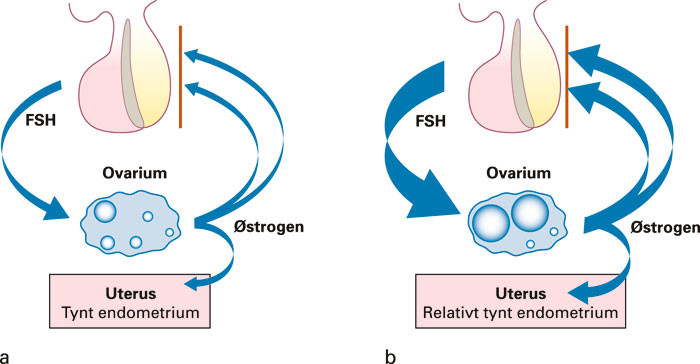 Både klomifensitrat og letrozol stimulerer eggstokkene ved å øke endogen produksjon av FSH. Klomifensitrat blokkerer kompetitivt østrogenreseptorene først og fremst i hypothalamus, men også i hypofysen (fig 1). I tillegg blokkerer klomifensitrat østrogenreseptorene i cervix og endometriet. Sentralt oppfattes blokkeringen av østrogenreseptorene som om det foreligger østrogenmangel, ettersom den negative tilbakekoblingsmekanismen settes ut av funksjon. Responsen fra hypofysen er økt frigjøring av FSH og LH, noe som stimulerer ovariene slik at follikler begynner å vokse.