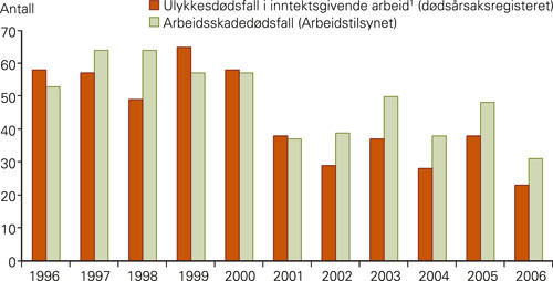 Pålitelig skadestatistikk er en forutsetning for skadeforebyggende arbeid. Arbeidsskadedødsfall brukes internasjonalt som indikator for risikonivået i arbeidslivet (1, 2). I Norge offentliggjør Arbeidstilsynet årlig statistikk over arbeidsskadedødsfall i landbasert virksomhet. I tillegg publiserer Statistisk sentralbyrå statistikk over arbeidsskadedødsfall i alle typer virksomhet (land, sjø, luft og sokkel), basert på opplysninger fra Folkehelseinstituttets nasjonale dødsårsaksregister. Definisjoner og inklusjonskriterier er ikke helt like i de to registrene, men det totale antallet dødsfall har vært nokså likt (fig 1) (3). Arbeidstilsynets registreringer har vært ansett som komplette fordi tallene har ligget relativt nær tallene i dødsårsaksstatistikken. Imidlertid har dette aldri vært undersøkt nærmere. Formålet med denne studien var å undersøke kvaliteten på Arbeidstilsynets register for arbeidsskadedødsfall og hvor komplett det er.