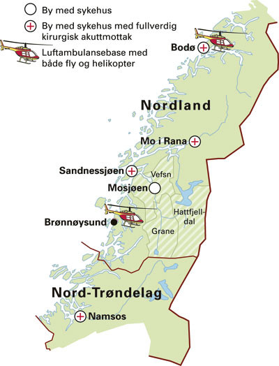 Det er tre små lokalsykehus på Helgeland, organisert som ett helseforetak med sykehusenheter i Mosjøen, Sandnessjøen og Rana. Nærmeste større sykehus er i Bodø, 330 km (fire timer og 30 minutter) unna med bil (fig 1). I området finnes 13 ambulansestasjoner med til sammen 16 døgnbemannede bilambulanser og sju ambulansebåter.