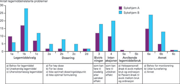 Figur 1 viser klassifiseringen av de legemiddelrelaterte problemene. Ved begge sykehjemmene utgjorde bruk av unødvendige legemidler og manglende monitorering nesten 40% av totalt antall identifiserte problemer. Vi fant 22 (sykehjem A) versus 38 (sykehjem B) legemiddelrelaterte problemer knyttet til interaksjoner og bivirkninger, og det var også flere problemer i kategorien uklar dokumentasjon ved sykehjem B.