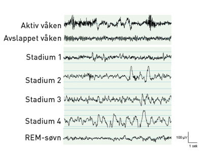 Den enkleste måten å måle søvnmengden på er å føre søvndagbok. Hver morgen noterer pasienten sengetid, antatt søvnlatens, eventuelle nattlige oppvåkninger, morgenoppvåkning og når vedkommende sto opp. Den klassiske objektive metoden å måle søvn på er polysomnografi, hvor blant annet elektroencefalografi (EEG), elektromyografi (EMG) og elektrookulografi (EOG) registreres. Ved en slik registrering får vi informasjon både om kvantiteten og kvaliteten av søvnen. Søvnen deles klassisk inn i fem stadier (7) (fig 1). Under våkenhet viser EEG rask frekvens og EMG tydelig høy muskeltonus. Når øynene lukkes, blir frekvensen langsommere og en rytmisk alfaaktivitet (8–13 Hz) kommer frem. Frekvensen er aldersavhengig, hos voksne ligger den normalt mellom 9 Hz og 12 Hz. Søvnstadium 1 er døsighet og en transisjon mellom våkenhet og søvn, der alfaaktiviteten gradvis avløses av langsommere thetaaktivitet (4–7 Hz). Stadium 2 er lett søvn med søvnspindler og såkalte K-komplekser. Søvnspindler er en rytmisk aktivitet (11–16 Hz, mest vanlig er 12–14 Hz) som oppstår ved redusert aktivering med nedsatt sensorisk informasjonsstrøm til thalamus. K-komplekser er reaksjon på plutselige eksterne stimuli. Stadium 3 og stadium 4 med langsom deltaaktivitet (< 2 Hz) er dyp søvn og blir ofte omtalt som «slow-wave sleep». Deltaaktiviteten uttrykker redusert sentralnervøs aktivering og anses som det nevrofysiologiske substrat for oppbygd søvnbehov eller homøostatisk faktor. Søvnstadiene 1–4 blir ofte med en fellesbetegnelse kalt non-REM eller NREM-søvn. I 2007 publiserte den amerikanske søvnforeningen nye regler for skåring av søvn og søvnrelaterte hendelser, blant annet slås stadium 3 og stadium 4 sammen til ett søvnstadium (N3) (8). Dette er foreløpig i liten grad implementert i litteraturen.