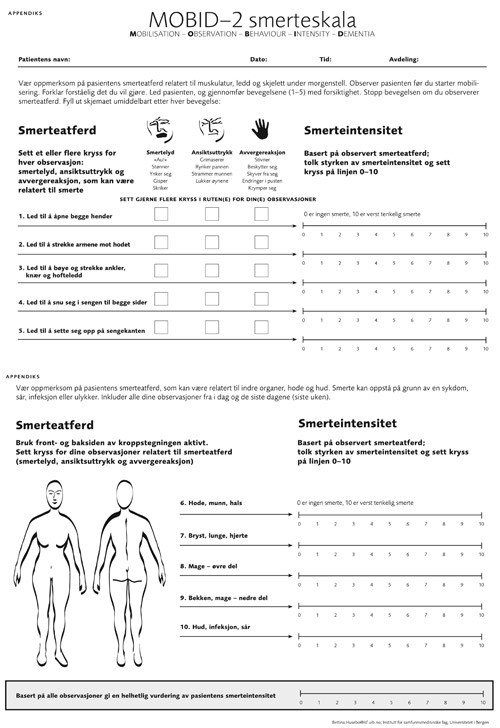 MOBID-2 smerteskala er utviklet for å sikre de dementes behov for kompetent smertevurdering og behandling. Deres sykdomsutvikling fratar oss den viktigste metoden til evaluering av smerte: anamnese og sykehistorie fortalt av pasienten selv (13). Hos pasienter med demens og kognitiv svikt vil observasjon av atferd, sykehistorie fortalt av andre, kroppsundersøkelse og kartlegging av smerterelaterte diagnoser gi viktig informasjon om mulige smerteplager. Pleiepersonalet som kjenner pasienten fra det daglige stell, har de beste forutsetninger for å vurdere pasientens atferd med henblikk på smerteproblemer.
