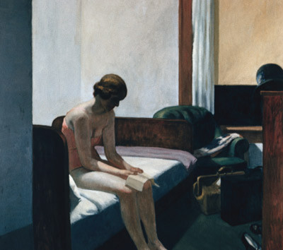 Edward Hoppers skikkelser er ensomme. Hans maleri Hotel room fra 1931 er ikonografisk for hans livsverk. Vi ser en delvis avkledd kvinne alene i et trangt hotellrom. Ansiktet er bokstavelig talt lagt i skygger. Hun leser i en rutebok, og skal altså videre. Bagasjen står uåpnet, og hun sitter på sengen i stedet for å ligge på den. Har hun sovet, eller har hun ikke fått sove? Det er et skremmende morgenlys i bildet.