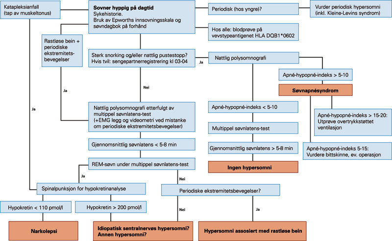 Utredning av hypersomni er viktig – fordi ubehandlet sykdom kan påvirke utdanning og yrkesutøvelse og fordi effektive medikamenter er tilgjengelige (11) (ramme 2, fig 1). Pasienter med narkolepsi har typisk mange korte søvnepisoder på dagtid, og de våkner uthvilt. Epworths innsovningsskala (ESS) viser en unormalt høy skåre (> 10 av 24) (12). Katapleksien kan være kortvarig og lokal, noe som gjør diagnostikken vanskelig. Nattesøvnen er av dårlig kvalitet, med gjentatte oppvåkninger (insomni). Symptomene debuterer gjerne omkring puberteten, men kan oppstå hos barn ned til to års alder (1, 9).